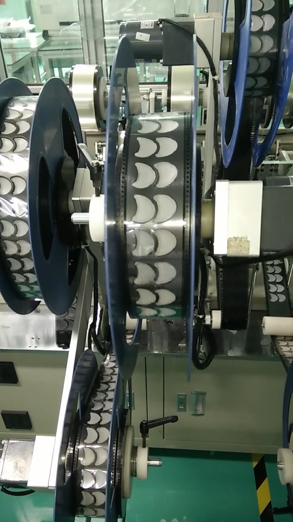 1. 先拉出原材卷料, 按設定的距離測試其氣流特性 2. 根據氣流特性值, 用不同的熔頭將其熔成不同的形狀 3. 冷卻成型後再次測試其氣流特性值, 判斷是否100%合格 4. 按氣流特性值自動分類, 裝入不同的編帶中 5. 自動將網布收卷包裝 |