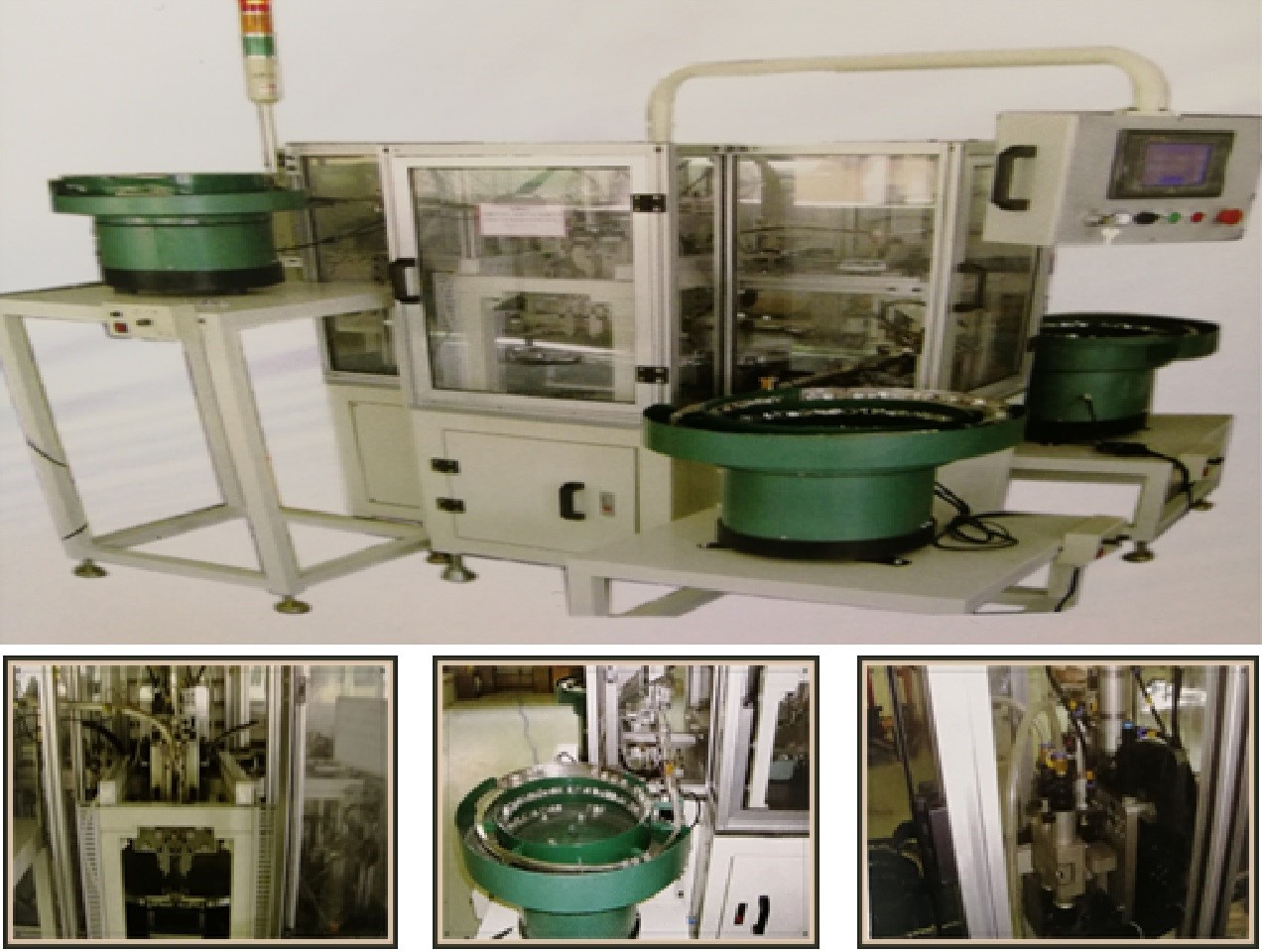 此生產設備應用於MCB端子自動組裝 端子、框架及螺絲都由振動盤自動出料 設備按要求將端子與框架自動裝配在一起後再自動將螺絲鎖入 自動檢測螺絲是否鎖入到位, 並根據檢測結果將成品自動下料到成品箱及不合格品箱 所有動作自動不需要人工干預 |